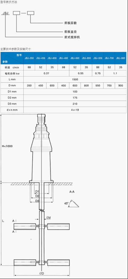 JBJ型槳式攪拌機(jī),有攪拌軸、攪拌槳葉、機(jī)座和驅(qū)動(dòng)裝置組成。
